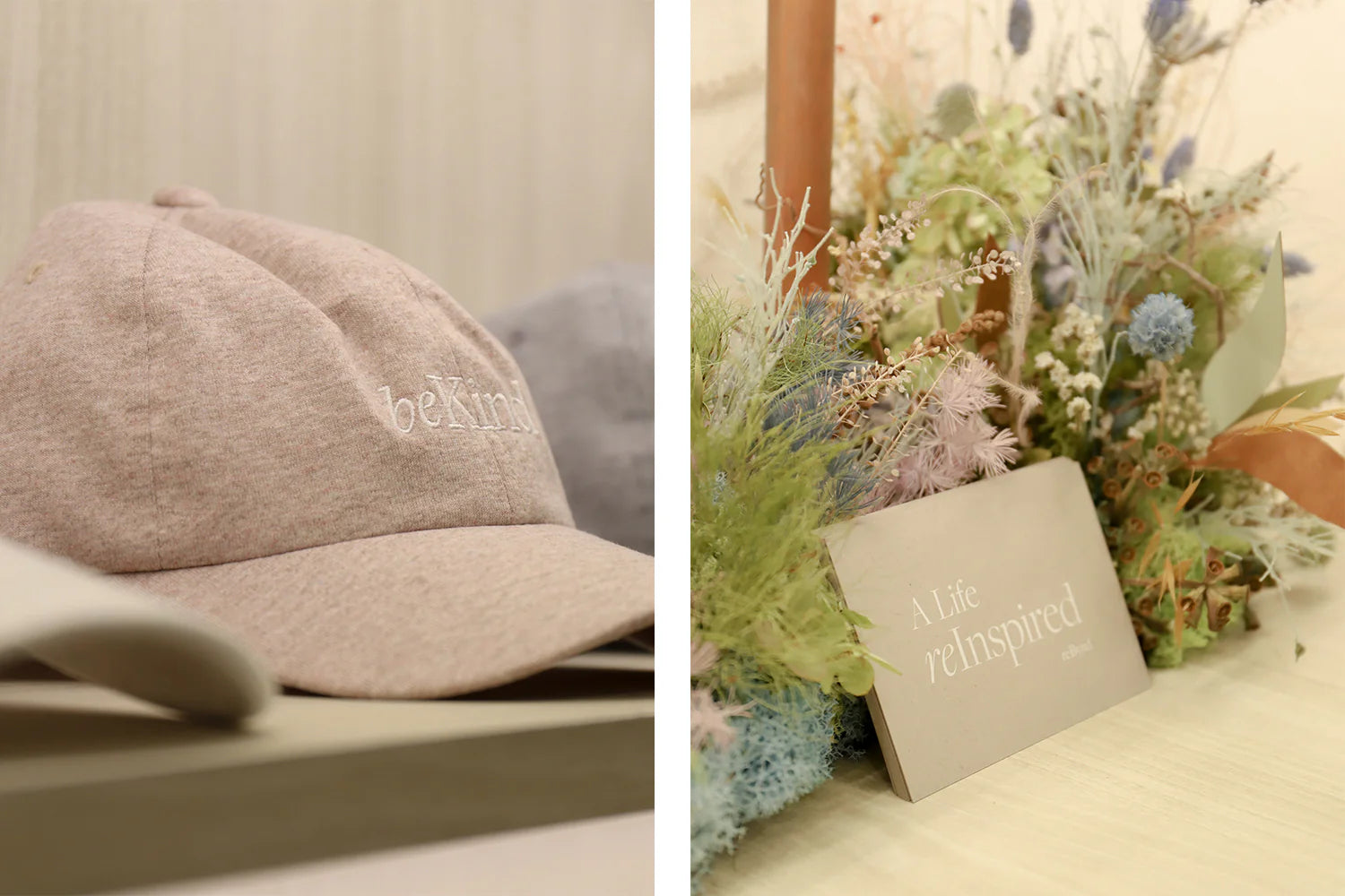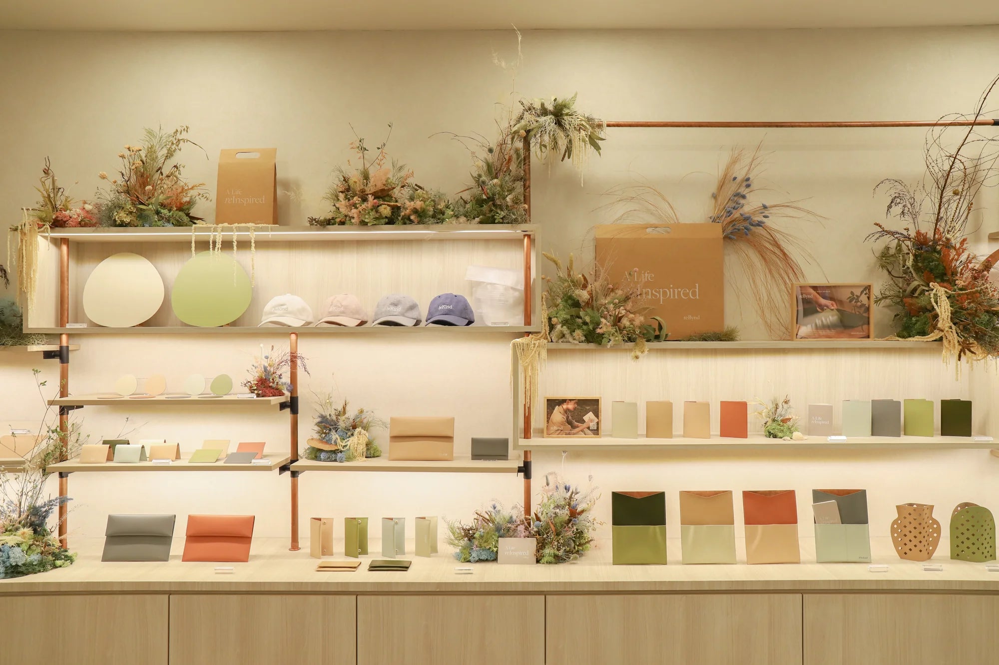 Our aim was to create a nature-inspired oasis. Slow down, recharge, return to your best self. Set against soulful dried-floral creations by Friday’s Garden featuring reBynd’s re- purposed leather leaves, here you could feel free and unhurried to explore a well-crafted collection of eco-friendly items — lifestyle objects in a soothing palette reimagined from recycled, upcycled and renewable raw materials for the home and work space, for your style, self-care rituals and journeys inwards and out.
